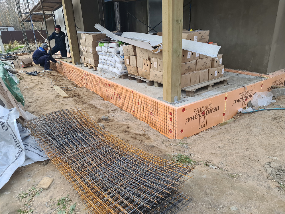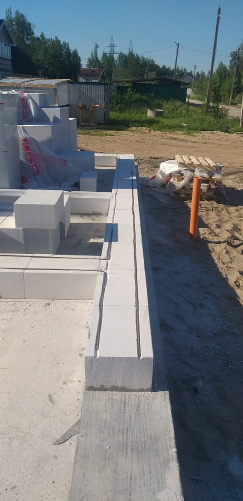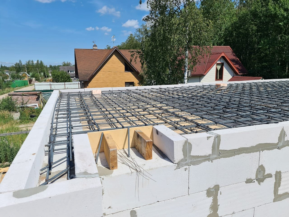 Базовое решение по стенам — газобетон шириной 300 мм, D400, с армированием каждого третьего ряда для повышения жёсткости и трещиностойкости. В условиях дефицита газобетона часть объёма была заменена на керамзитобетонные блоки, согласованные с заводом «Экобетон», при этом конструктивные требования по несущей способности и теплотехнике были сохранены.