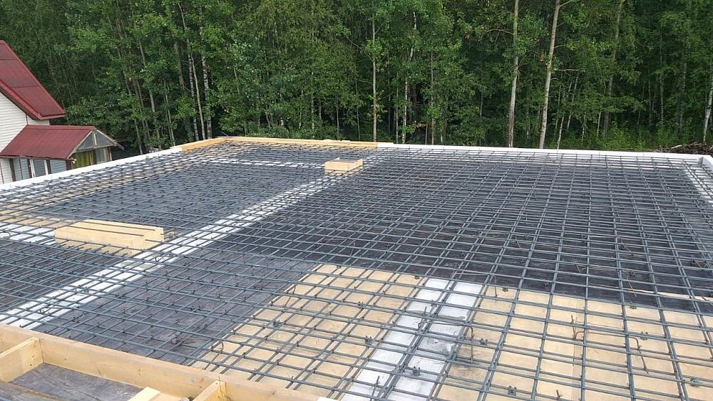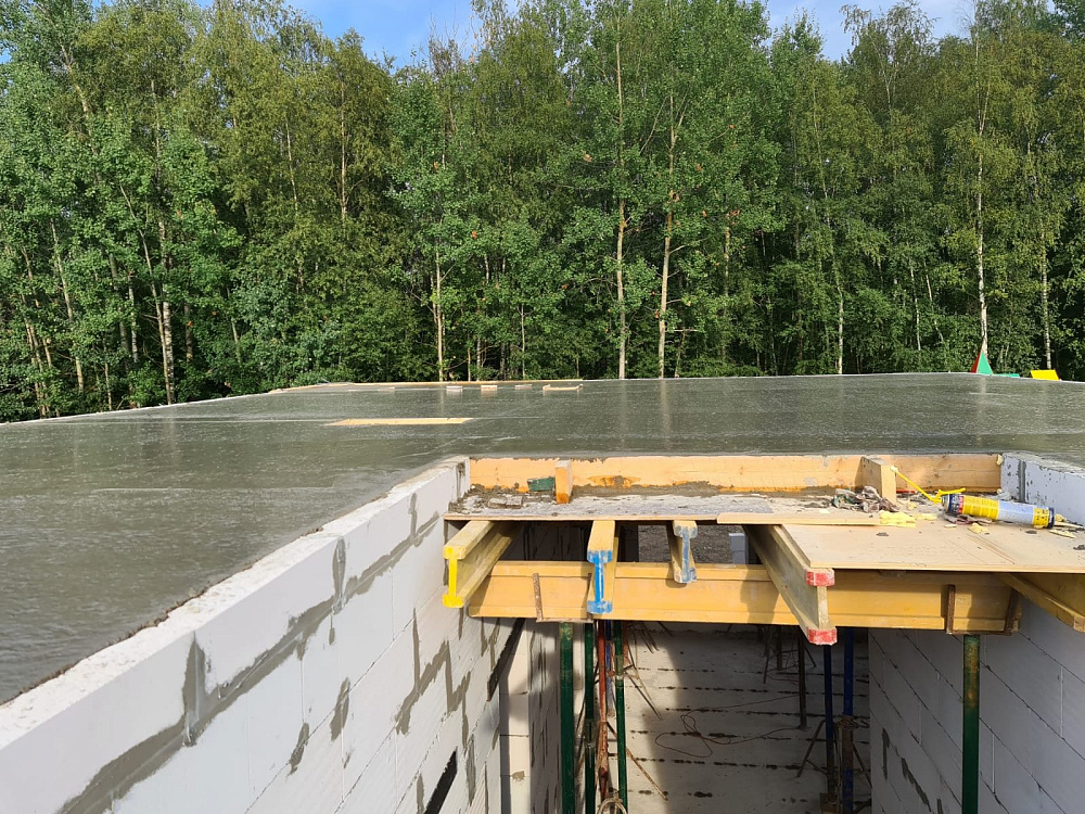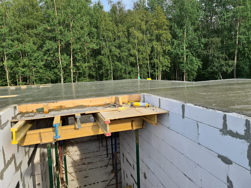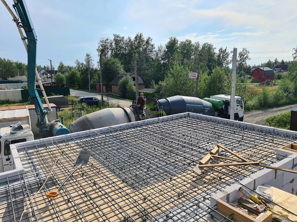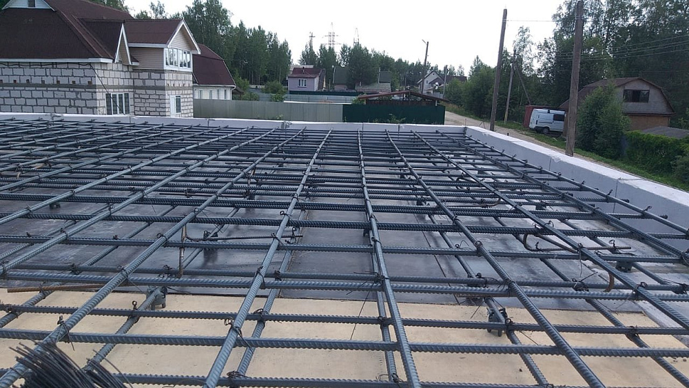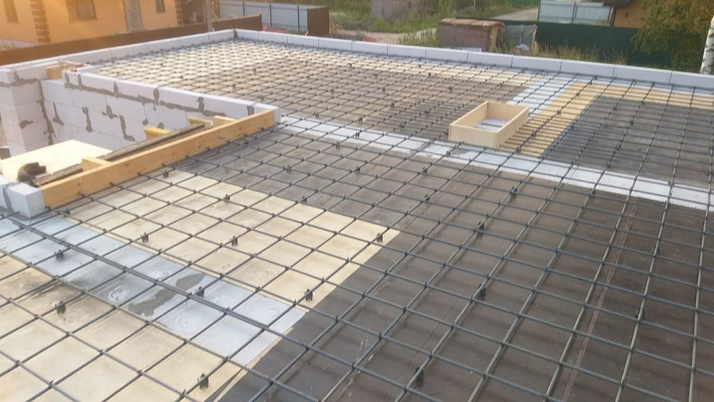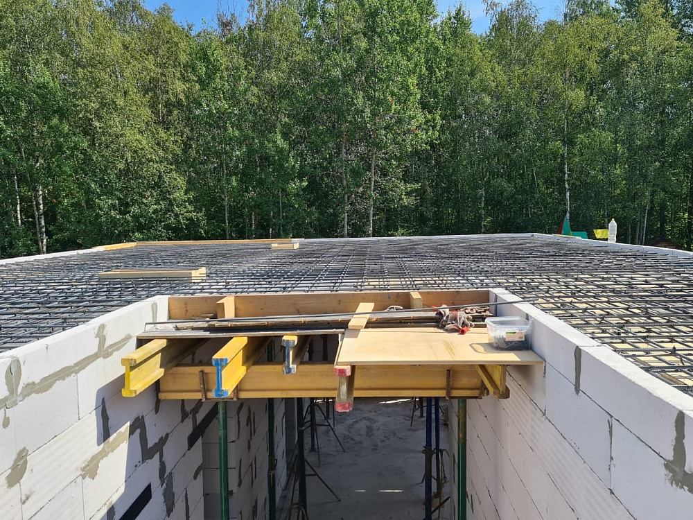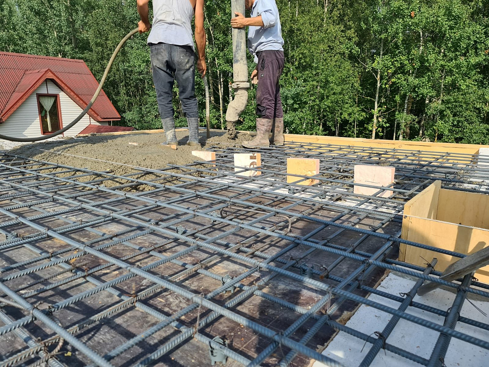 Перекрытие между первым и вторым этажом выполнено в виде монолитной железобетонной плиты толщиной 250 мм с двойным армированием арматурой диаметром 12 мм. Такой запас прочности обеспечивает отсутствие вибраций и комфорт при эксплуатации, а также хорошо работает в паре с уже существующей плитой фундамента на забивных сваях .