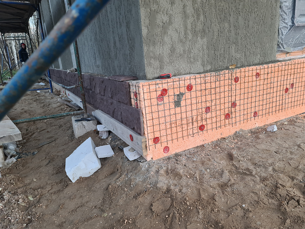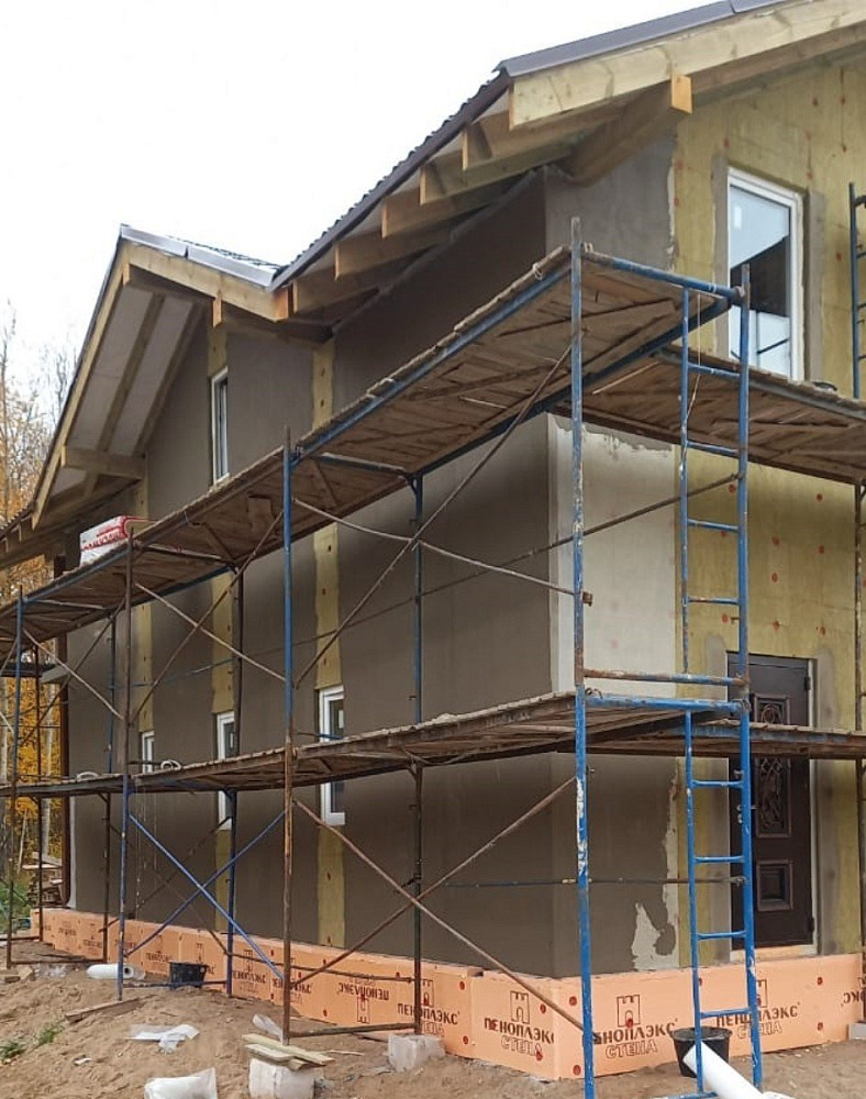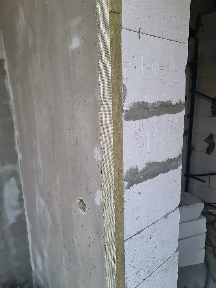 Фасад дополнительно утеплён минераловатными плитами Rockwool для фасадов, что улучшило энергосберегающие характеристики дома и подготовило ровное основание под финишное покрытие.