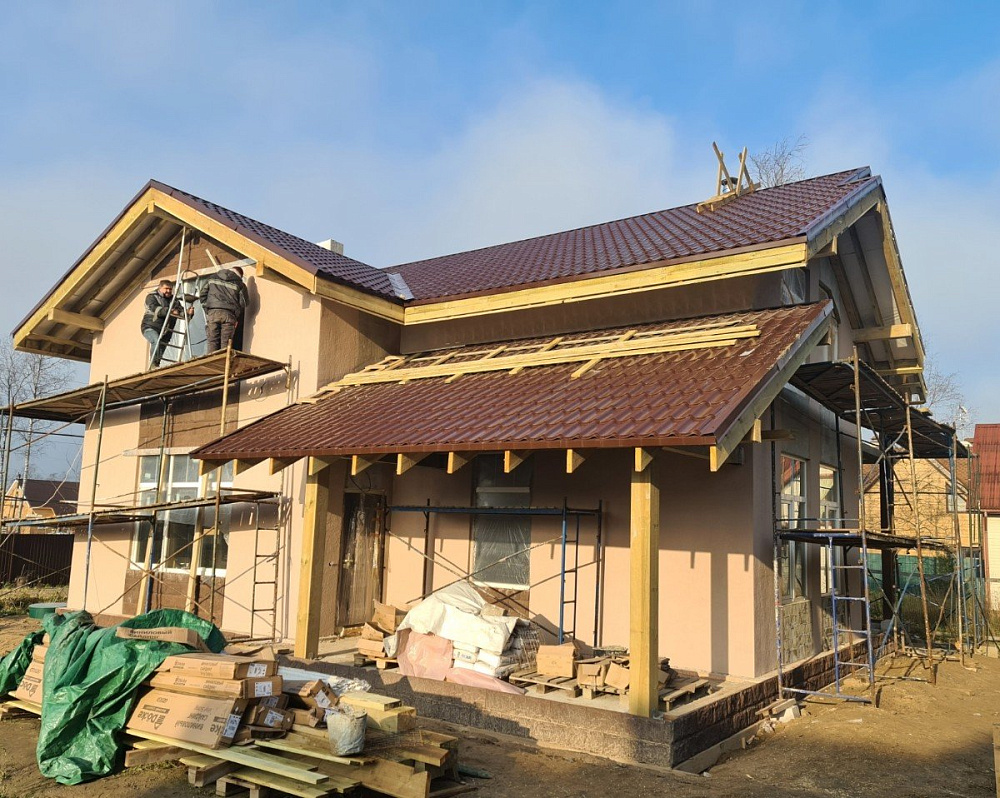 Кровельный пирог включает обрешётку и контробрешётку под финишное покрытие из металлочерепицы Grand Line. Такое решение устойчиво к климату Ленинградской области и хорошо сочетается с декоративной штукатуркой фасада.