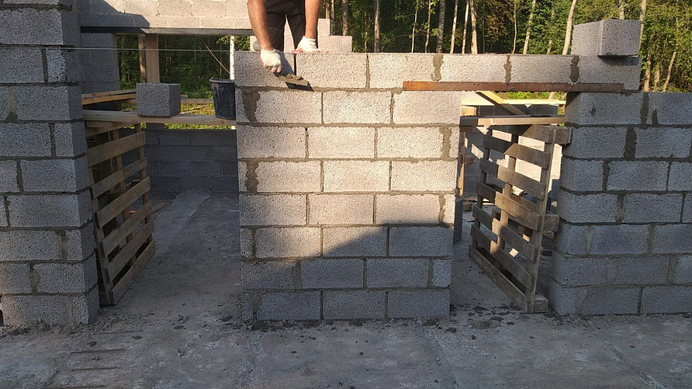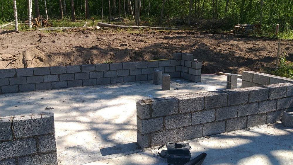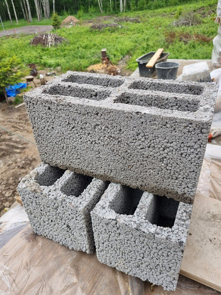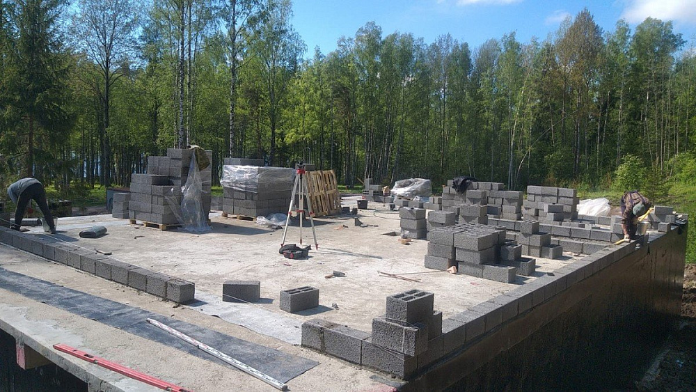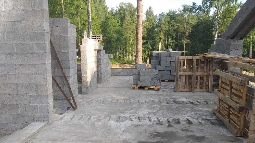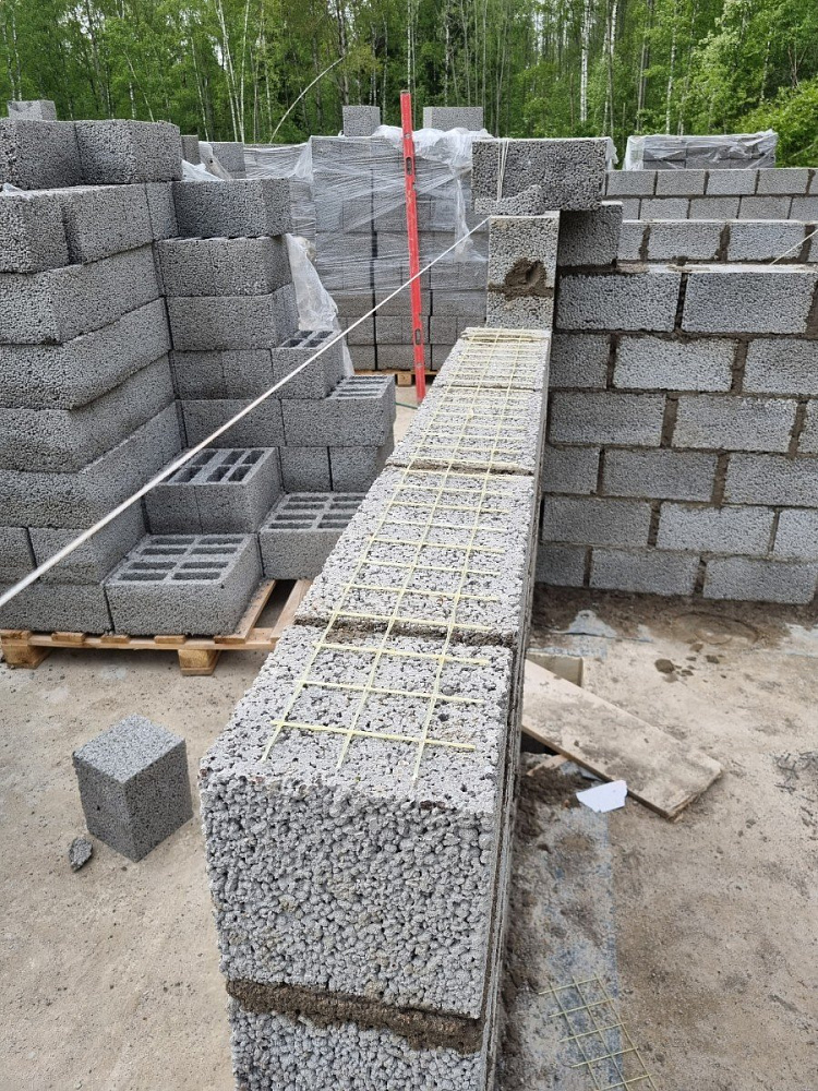- Построен из керамзитобетонных блоков размером 200×400 мм