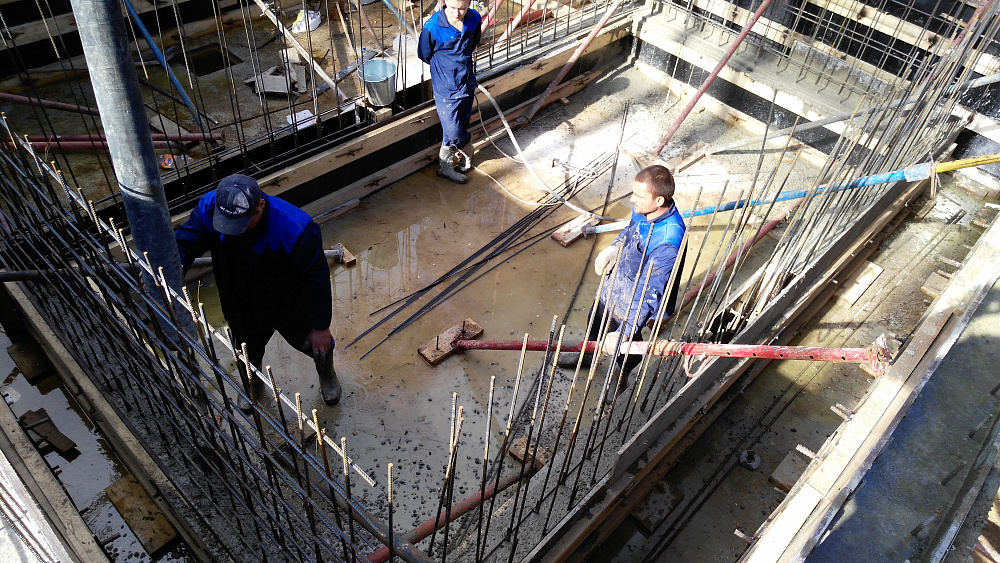 Все узлы сопряжения чаши бассейна с фундаментной плитой выполнялись с высокой геометрической точностью и с учётом требований к гидроизоляции. Такой подход позволяет избежать трещин в зоне бассейна и обеспечить надёжную работу конструкции в течение всего срока эксплуатации.