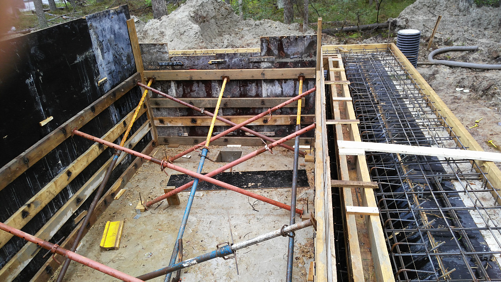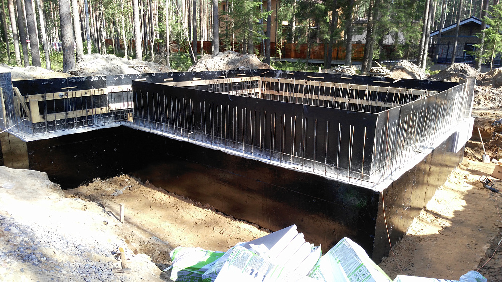 Конструкция фундамента — плитного типа с рёбрами жёсткости вверх, рассчитана на повышенные нагрузки от массивного здания и чаши бассейна. Такой тип плиты мы рекомендуем для домов из тяжёлых материалов (керамзитобетон, кирпич) и сложных по конструктиву объектов.