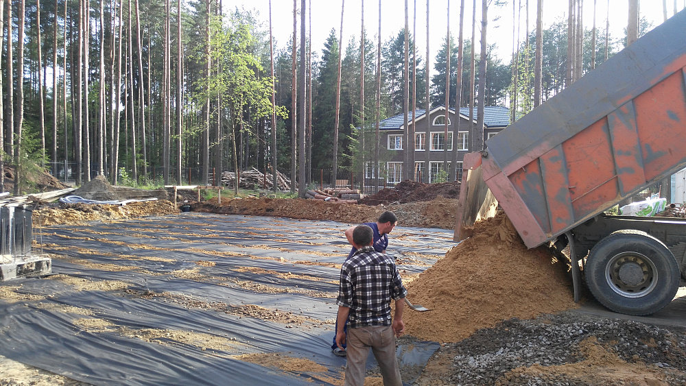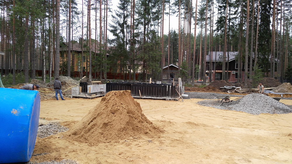 Под фундаментной плитой была устроена песчаная подушка, обеспечивающая равномерное распределение нагрузок и снижение влияния деформаций грунта. Толщина и схема уплотнения подсыпки подбирались с учётом инженерно-геологических условий участка.