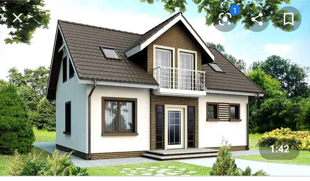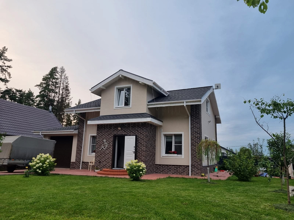 Коттедж из кирпича ЛСР. Отделка фасада камнем травертин.