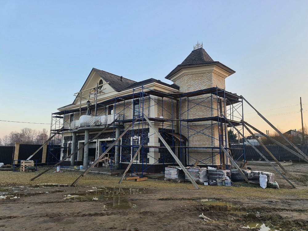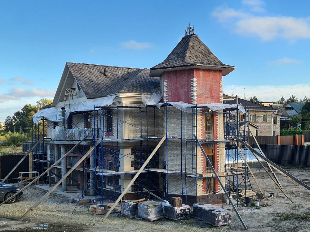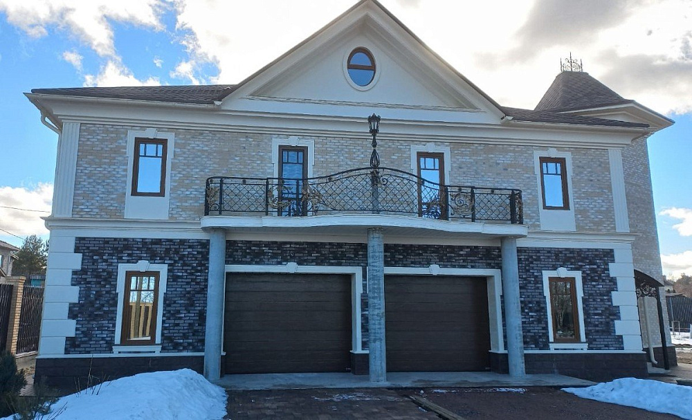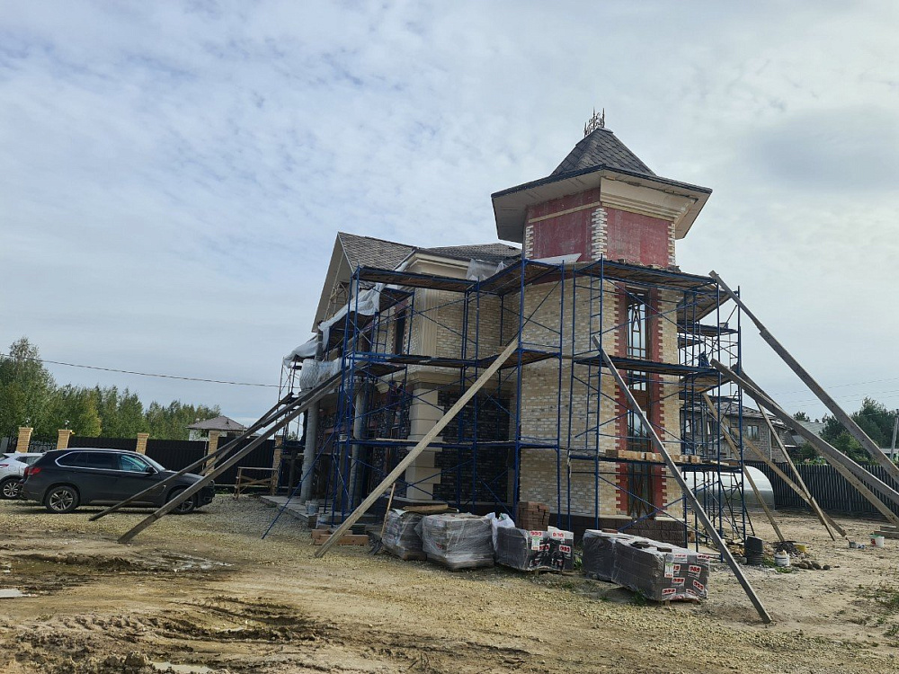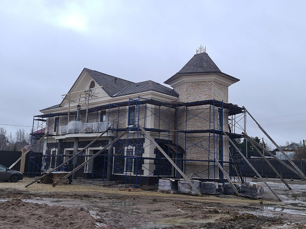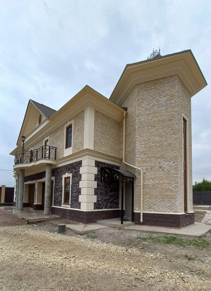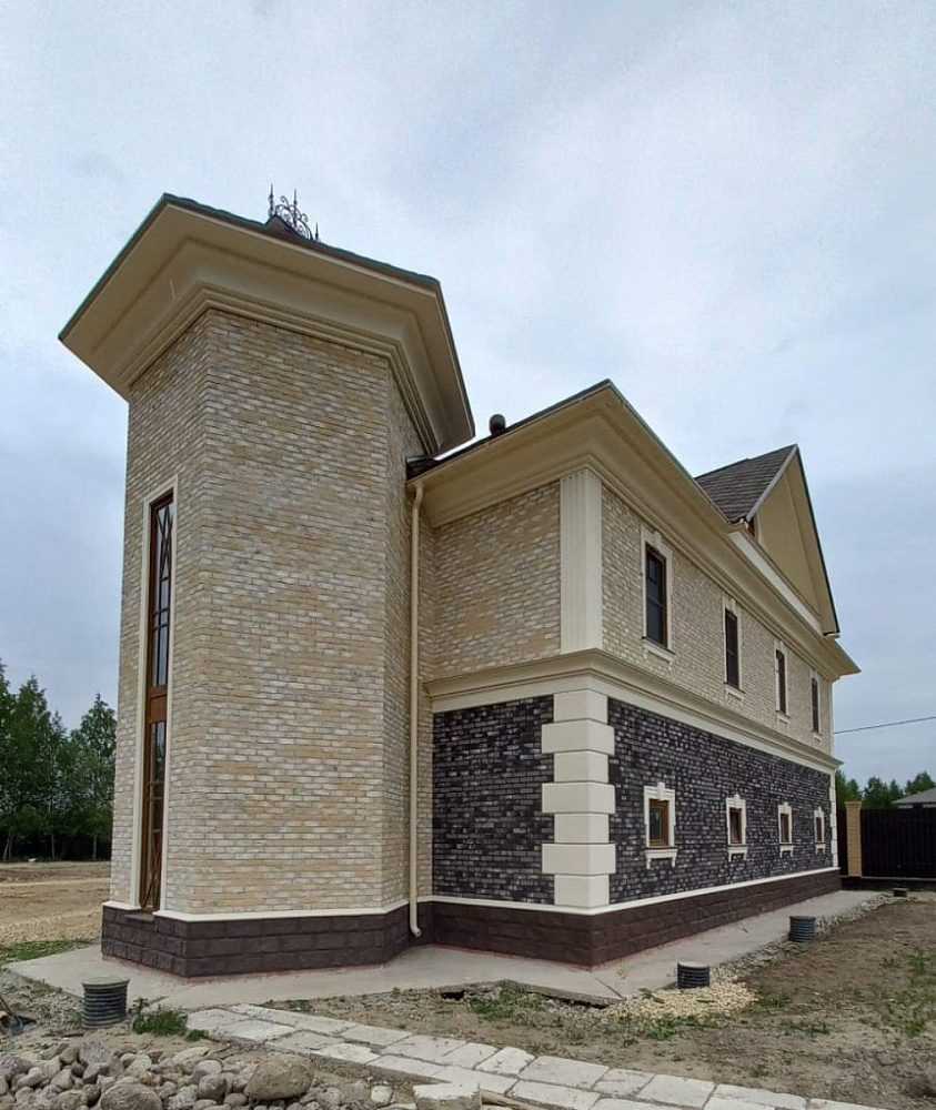 Представленный объект — двухэтажный коттедж с выразительной архитектурой: башенками, фронтонами и балконами. Все фасады облицованы клинкерной плиткой, имитирующей натуральный кирпич, с аккуратной раскладкой и продуманной цветовой схемой.