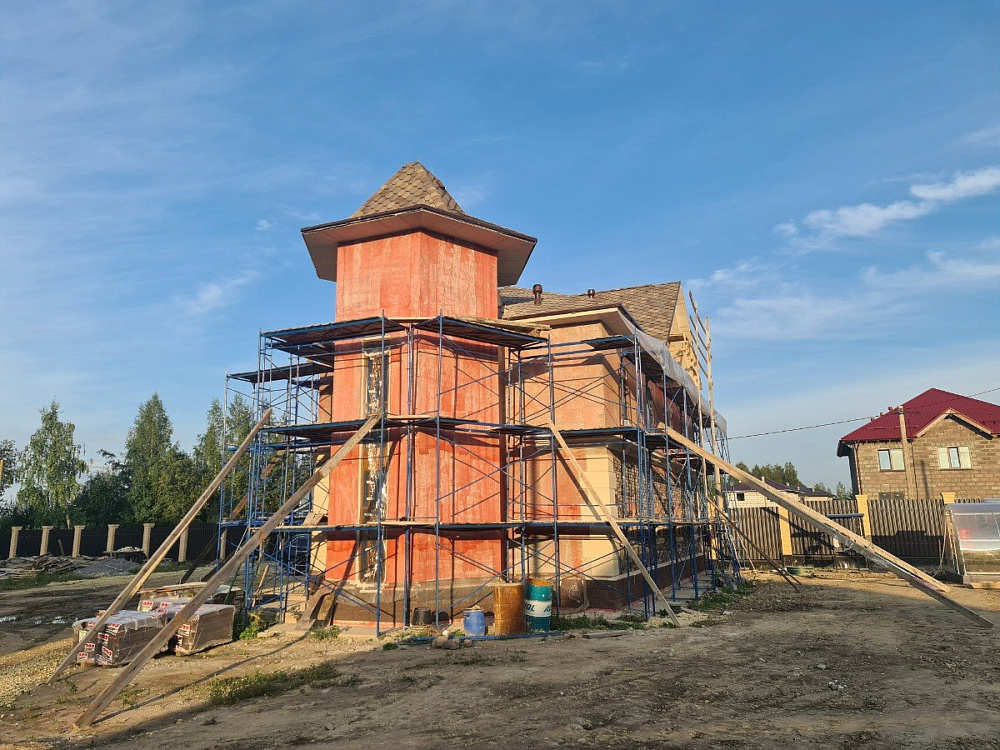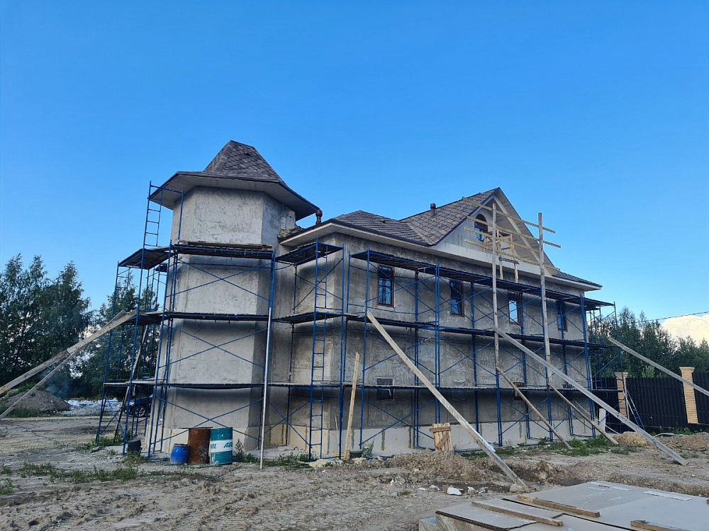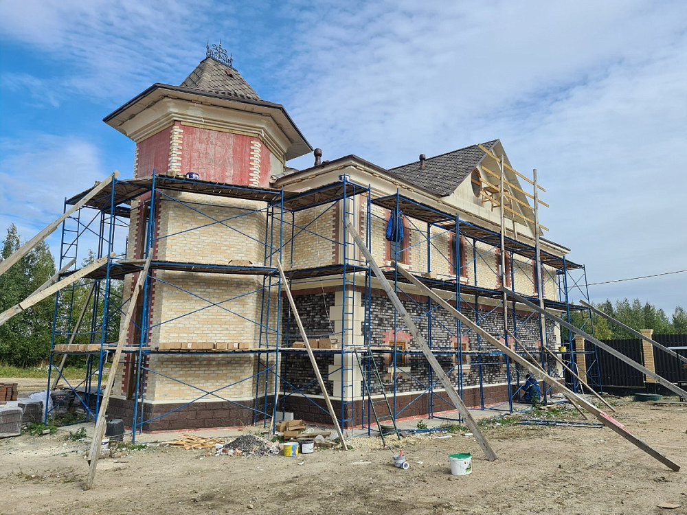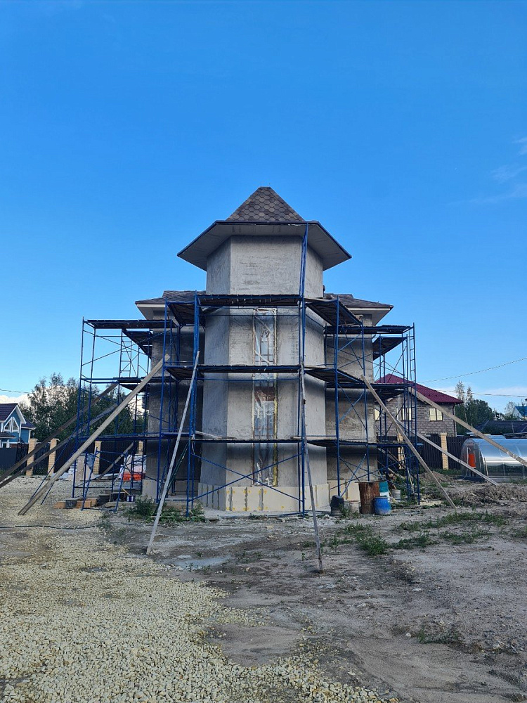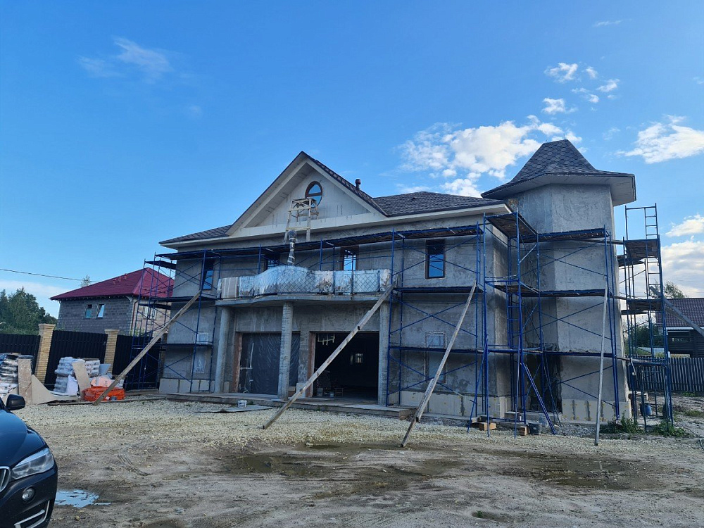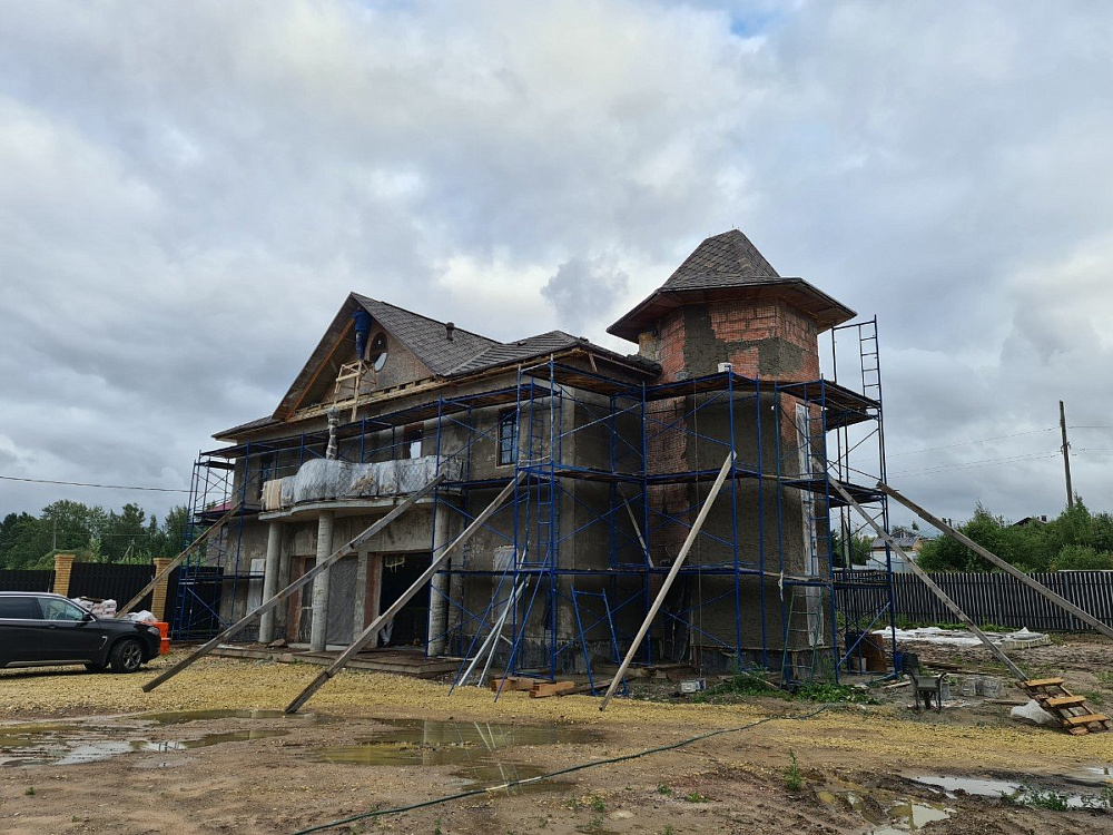 Представленный объект — двухэтажный коттедж с выразительной архитектурой: башенками, фронтонами и балконами. Все фасады облицованы клинкерной плиткой, имитирующей натуральный кирпич, с аккуратной раскладкой и продуманной цветовой схемой.