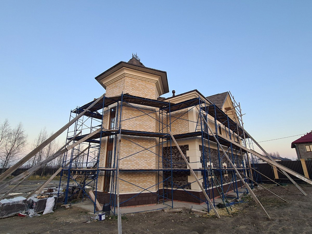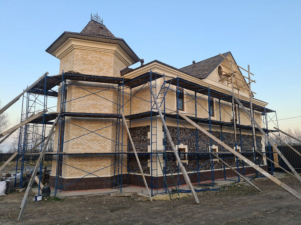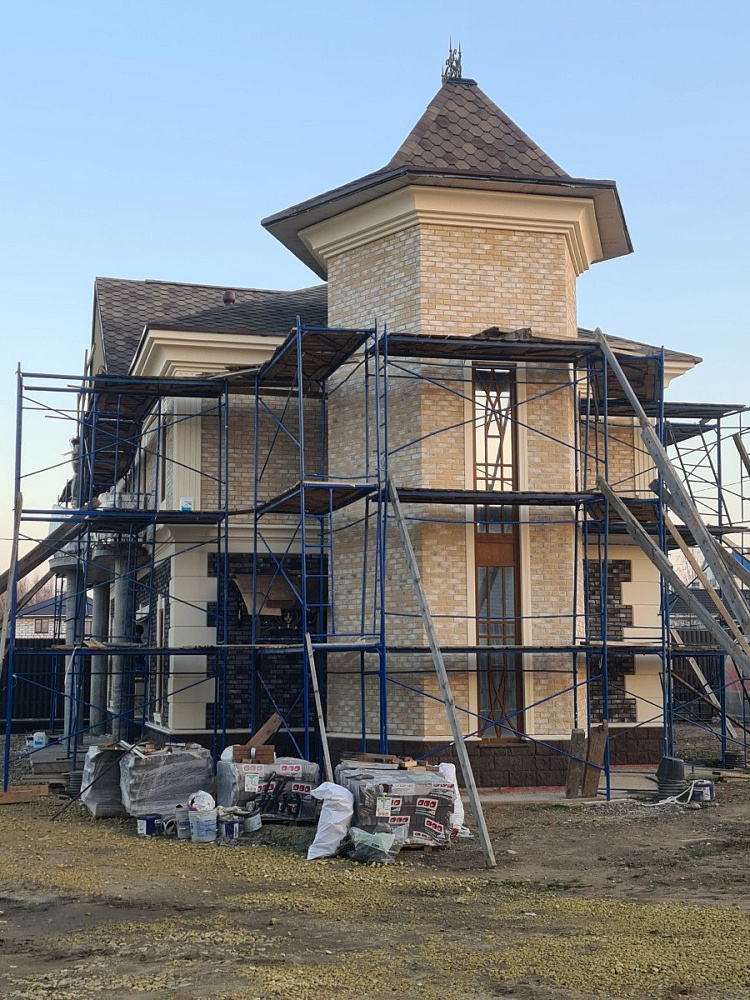 Особое внимание уделялось точности горизонтали рядов, подбору схемы перевязки швов и аккуратной затирке, чтобы фасад выглядел цельно и естественно, как кирпичная кладка.