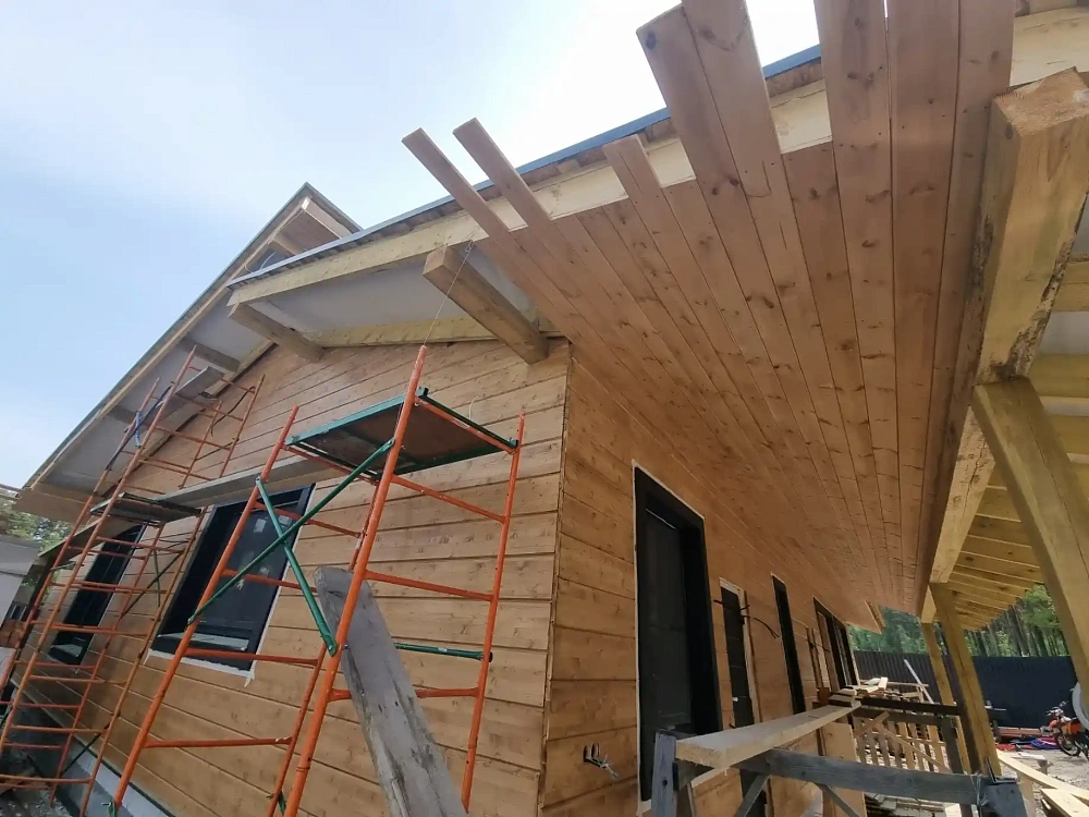Отделка дома с гаражом имитацией бруса под ключ в деревне Овраги, Ленинградская область.