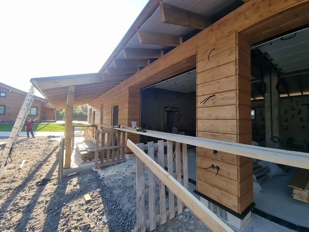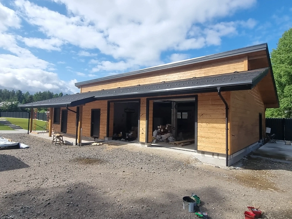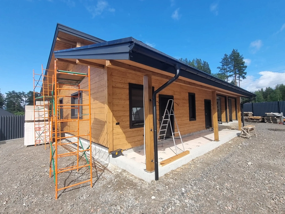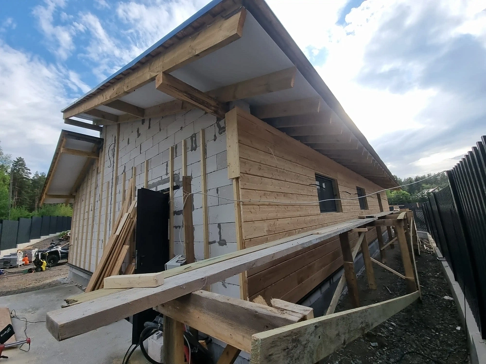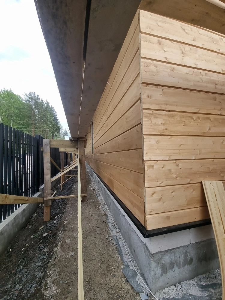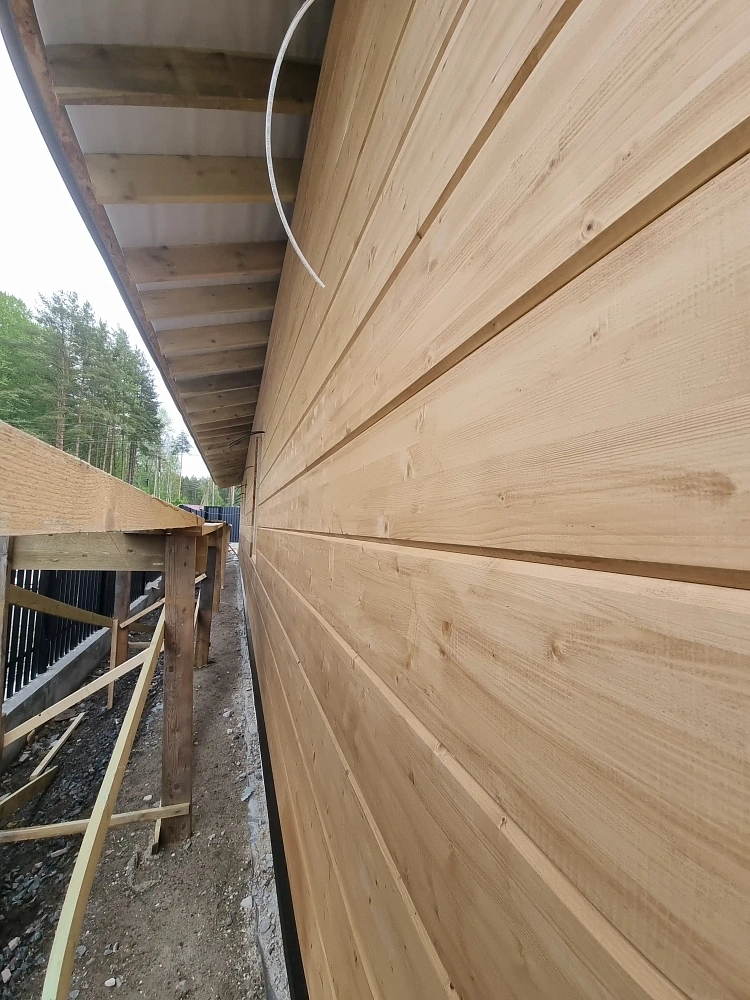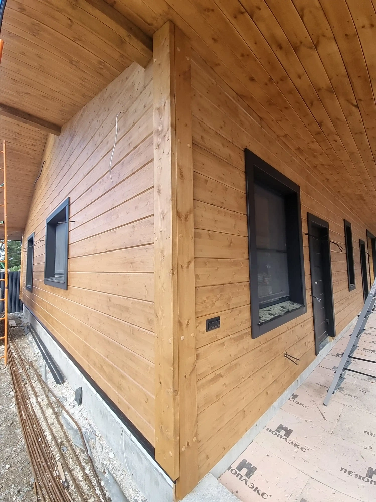 Для отделки фасада использована имитация бруса сечением 27×225 мм — сухая, клееная древесина высокого качества. Материал смонтирован на вентилируемый фасад с обрешёткой из сухого строганого бруска сечением 30×45 мм сорта АВ длиной 3000 мм.