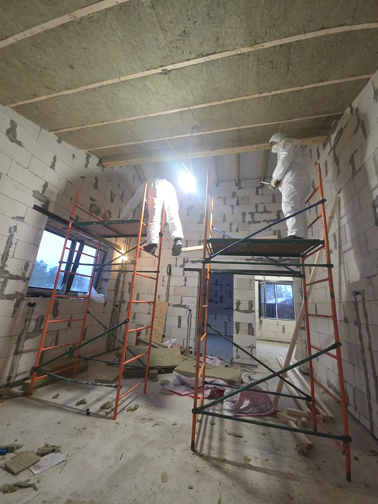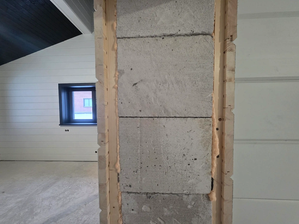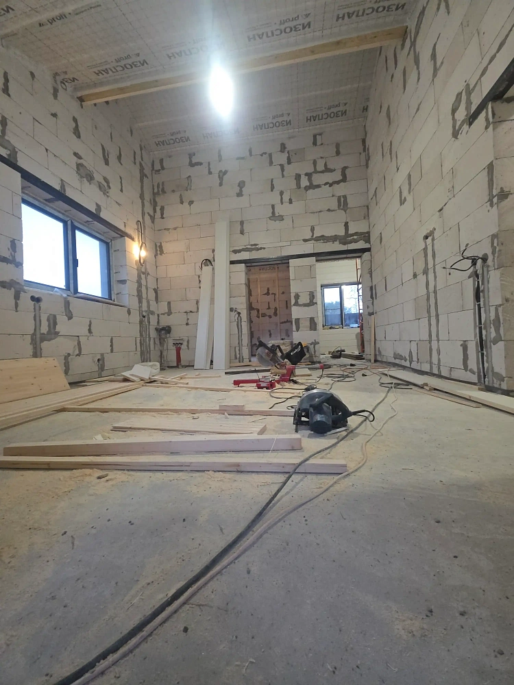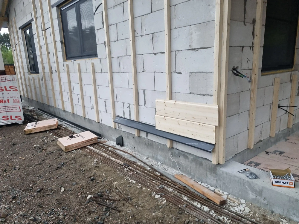 Крепление брусков к основанию выполнено анкер-шурупами Sormat SCS для бетона 6×100 мм — надёжное и долговечное решение, обеспечивающее прочную фиксацию обрешётки к газобетонным стенам. Весь пиломатериал обработан безцветным антисептиком для защиты от влаги и биопоражений.