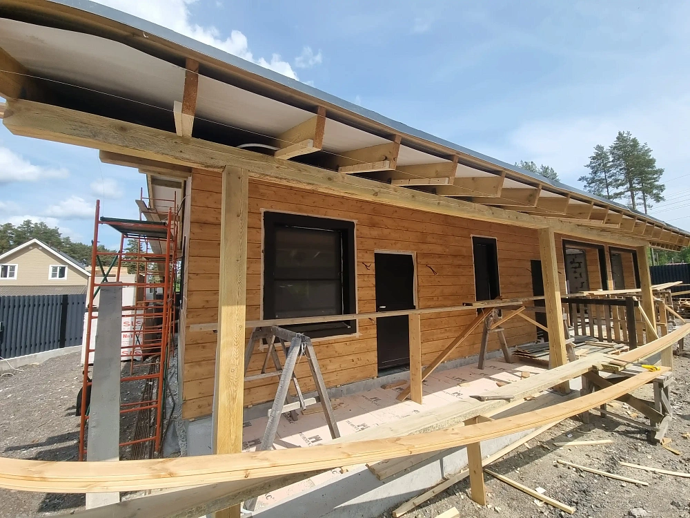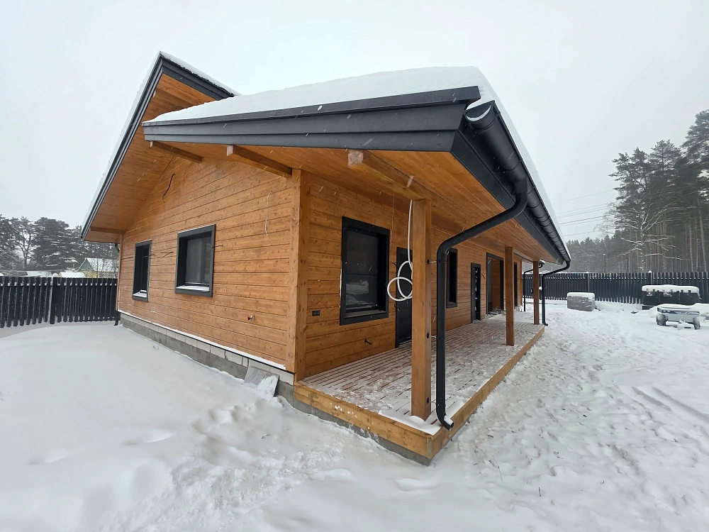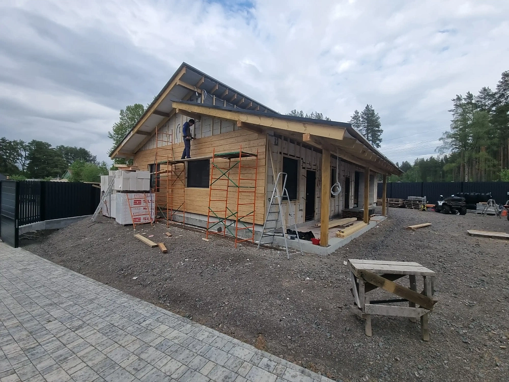 Получен крепкий, уютный загородный дом, сочетающий надёжность конструкции с изысканностью деревянной отделки. Фасад гармонично смотрится как в солнечную погоду, так и в серых условиях климата Ленинградской области.