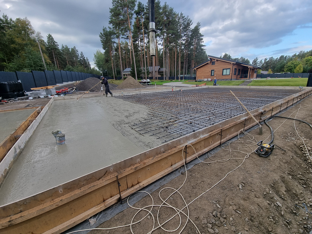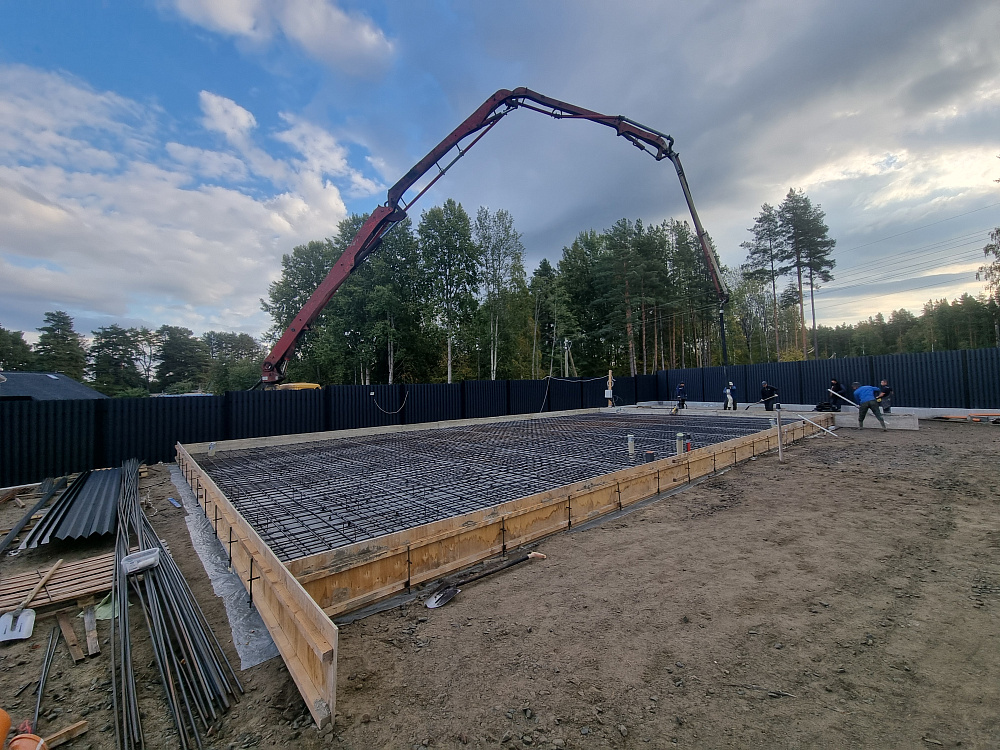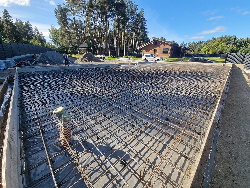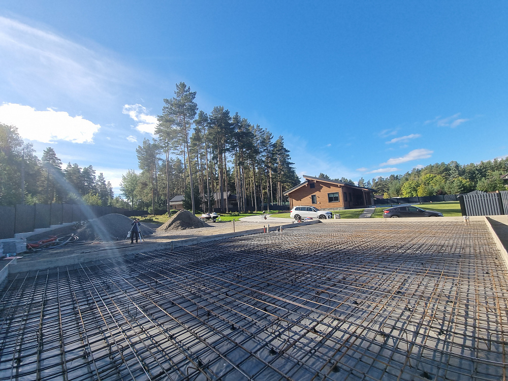 Заказчику было важно получить ровную, прочную и долговечную фундаментную плиту, которая выдержит нагрузку гаража из газобетона и жилого блока, а также будет устойчива к повышенной влажности и возможным подвижкам грунта в прибрежной зоне.