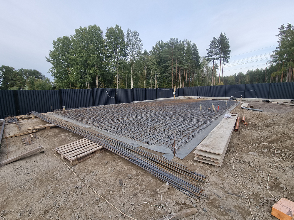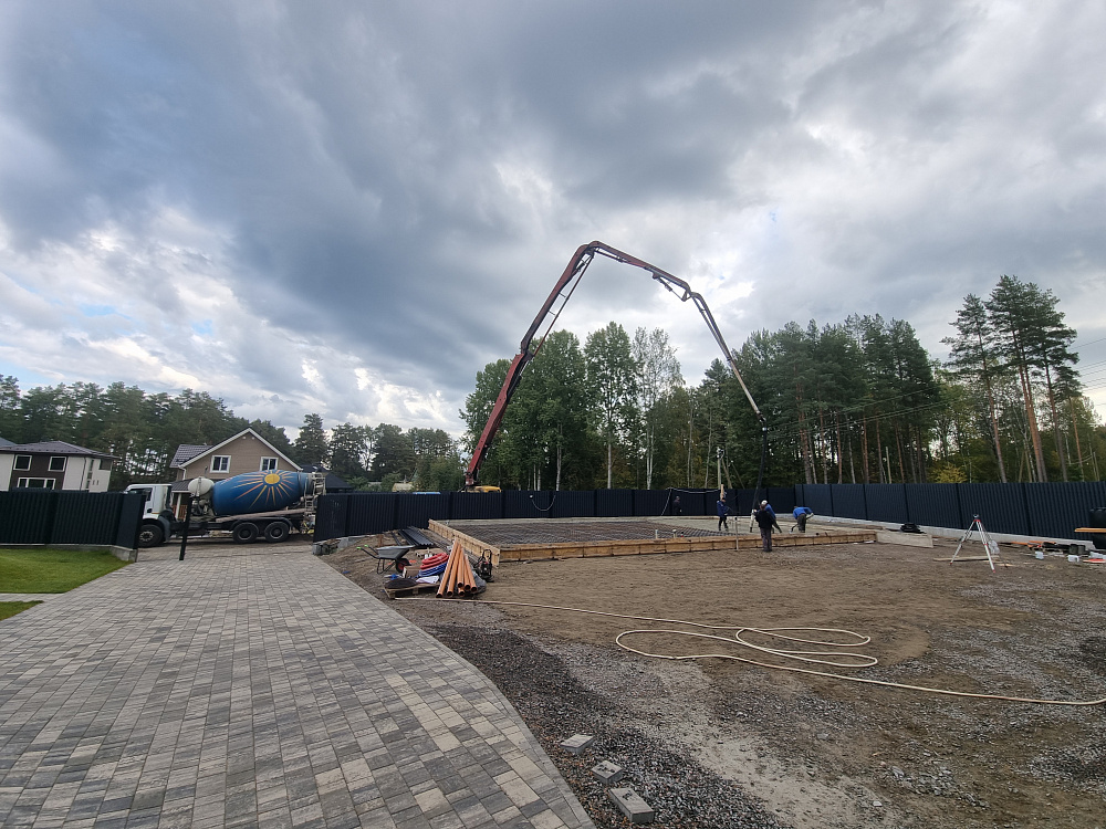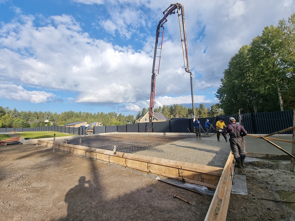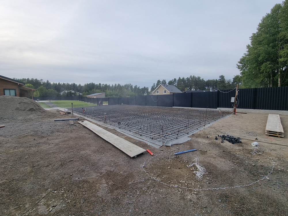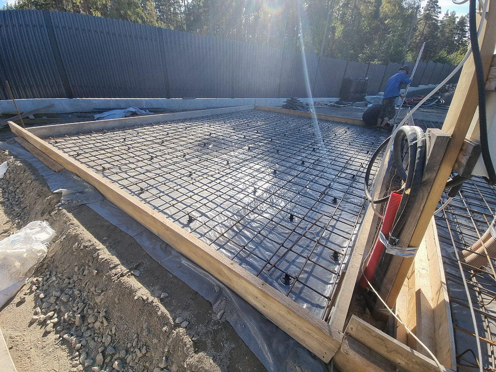 Заказчику было важно получить ровную, прочную и долговечную фундаментную плиту, которая выдержит нагрузку гаража из газобетона и жилого блока, а также будет устойчива к повышенной влажности и возможным подвижкам грунта в прибрежной зоне.
