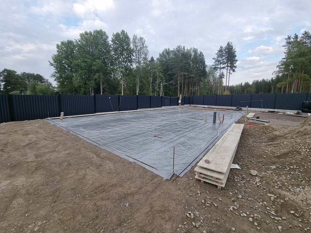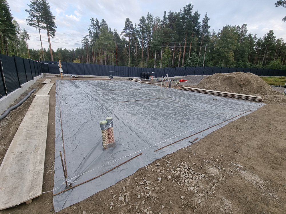 Для защиты фундамента от влаги и предотвращения ухода цементного молочка в подсыпку под плиту использована утолщённая полиэтиленовая плёнка. Это простое, но крайне эффективное решение, которое повышает долговечность монолитной конструкции.