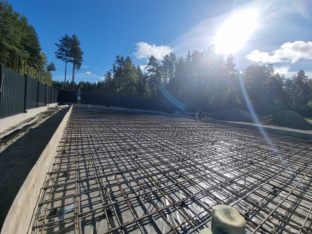 Монолитная фундаментная плита под гараж на два автомобиля с жилой зоной 60 м² в деревне Овраги, Приозерский район, на берегу реки Вуокса. Надёжное основание для гаража из газобетона и жилого блока на сложных грунтах.