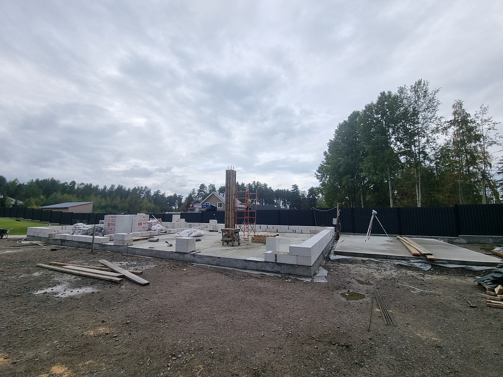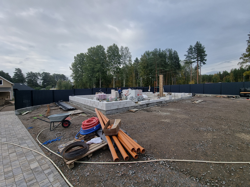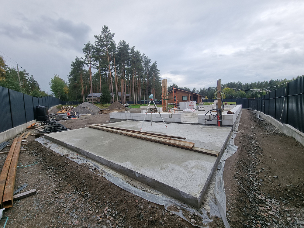 На этом объекте мы выполнили строительство монолитного фундамента под гараж на два автомобиля с жилой зоной площадью около 60 м². Участок расположен в живописной деревне Овраги Приозерского района Ленинградской области, недалеко от берега реки Вуокса.