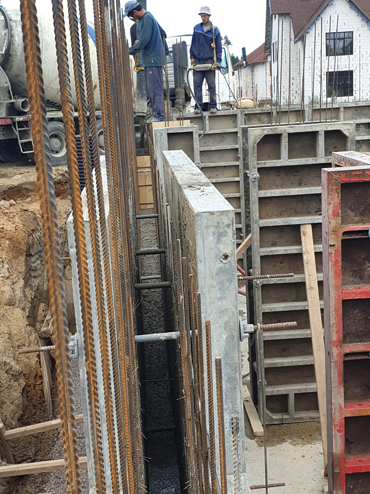 - Монтаж щитовой опалубки с установкой укосин и стяжек