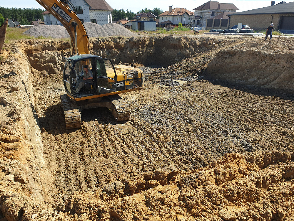 Работы начались с разработки котлована. Использовали гусеничный экскаватор грузоподъёмностью 22 тонны, что позволило быстро и эффективно выкопать котлован на проектную глубину. Весь вынутый грунт вывезли с участка, освободив место под строительство.
