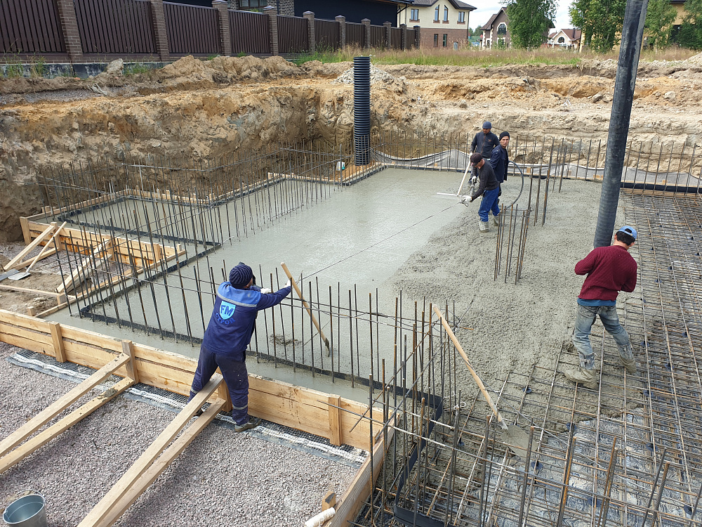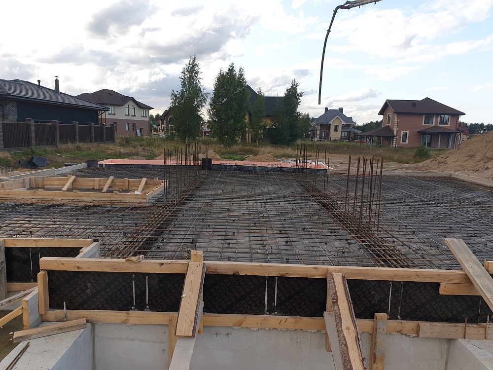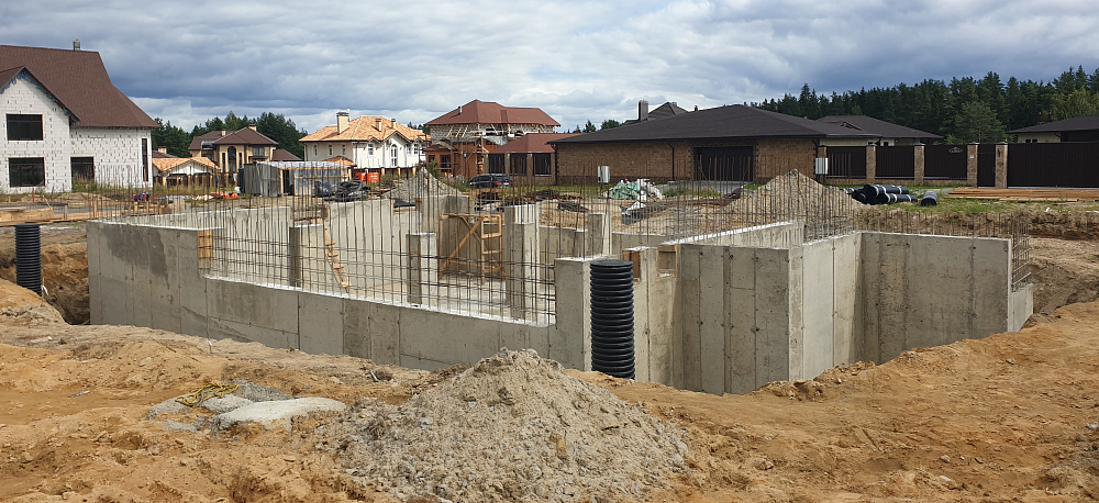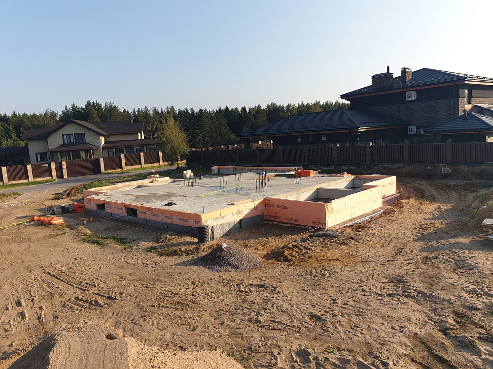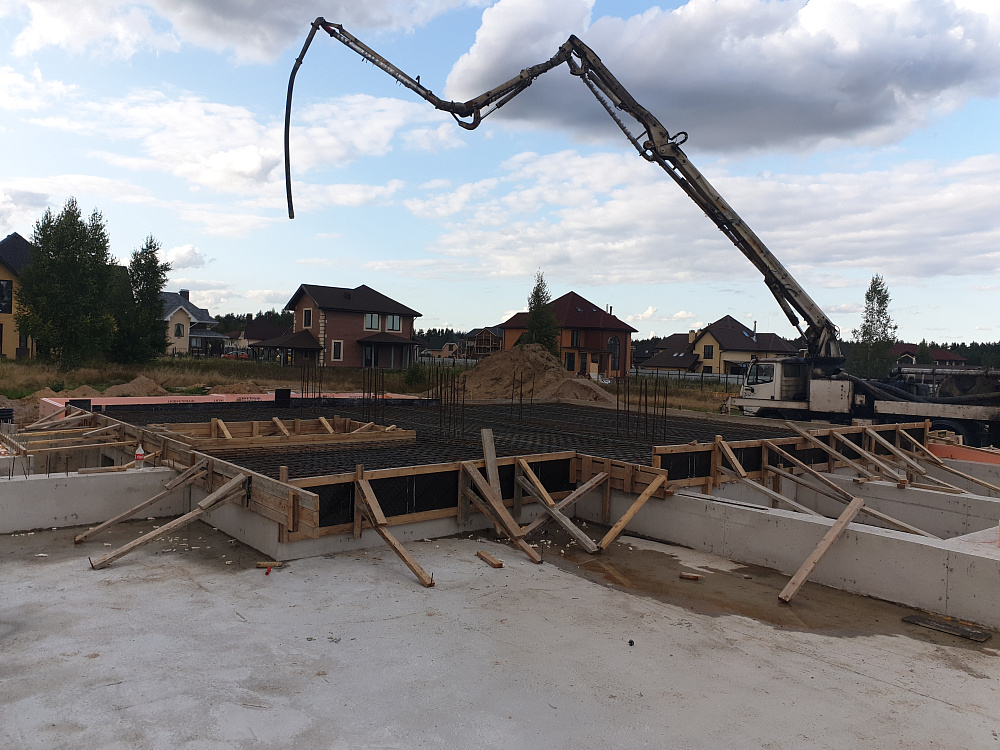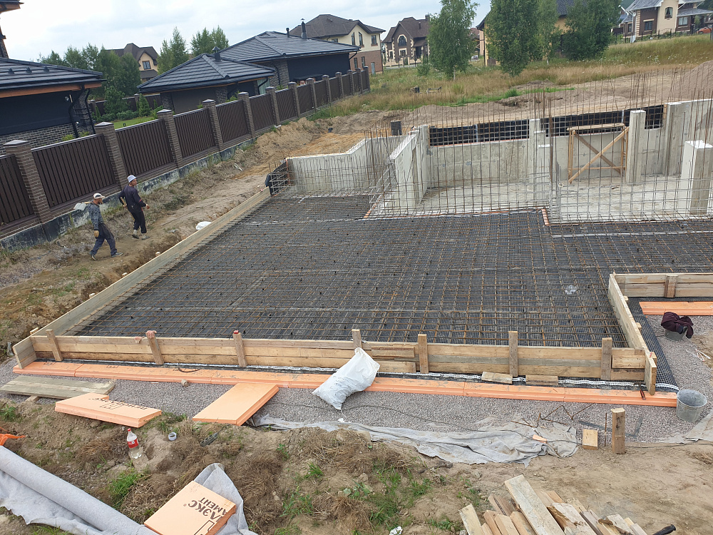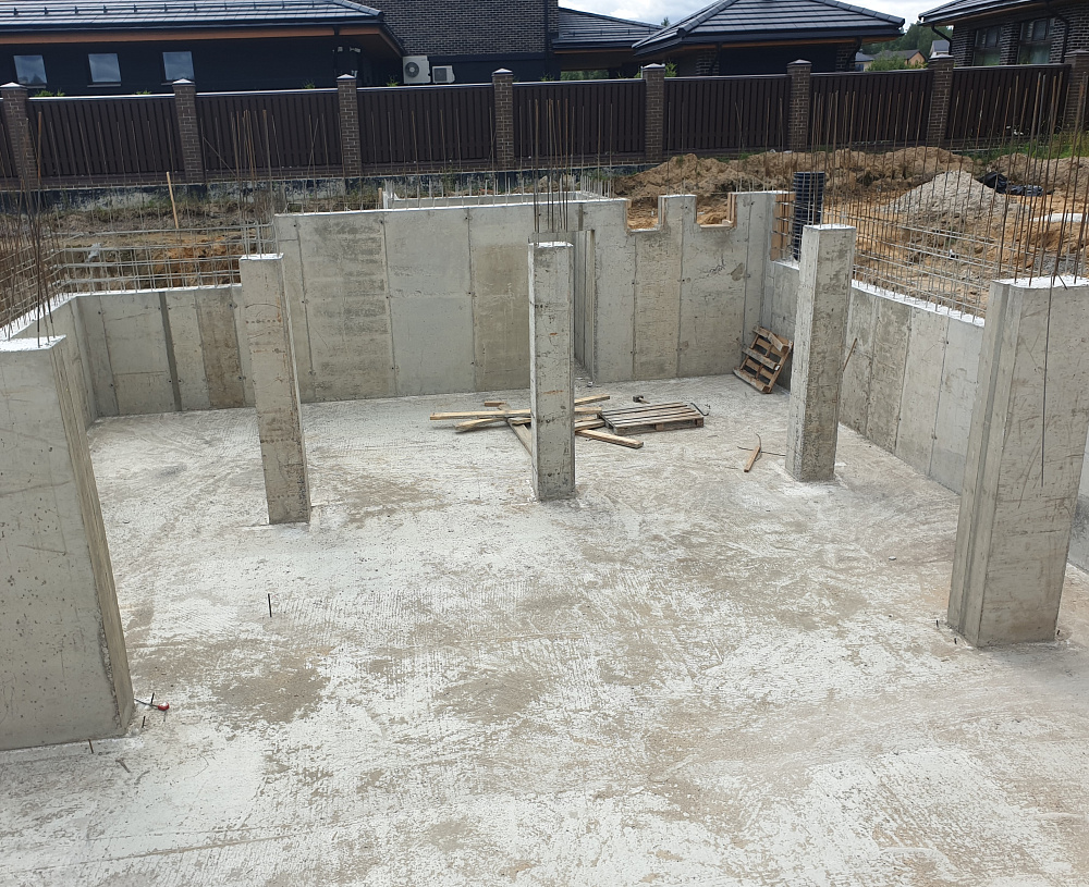 Завершающим этапом строительства цокольного этажа стало устройство монолитного перекрытия толщиной 200 мм. После демонтажа стеновой опалубки смонтировали опалубку перекрытия на инвентарных стойках, выполнили армирование и залили перекрытие одновременно с частью фундамента основного дома — это обеспечило монолитность всей конструкции.