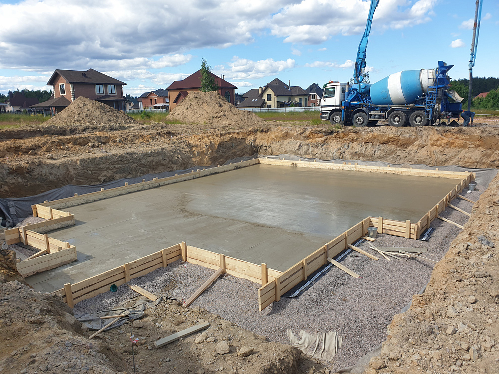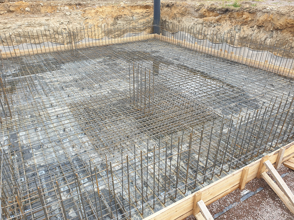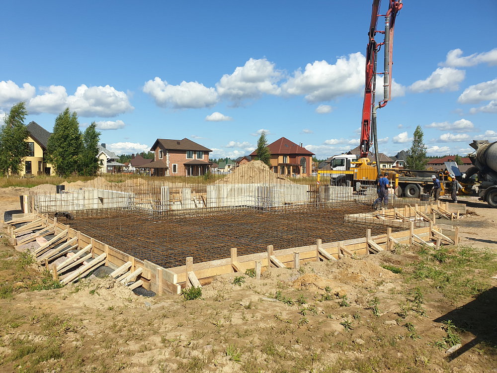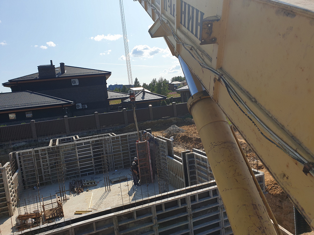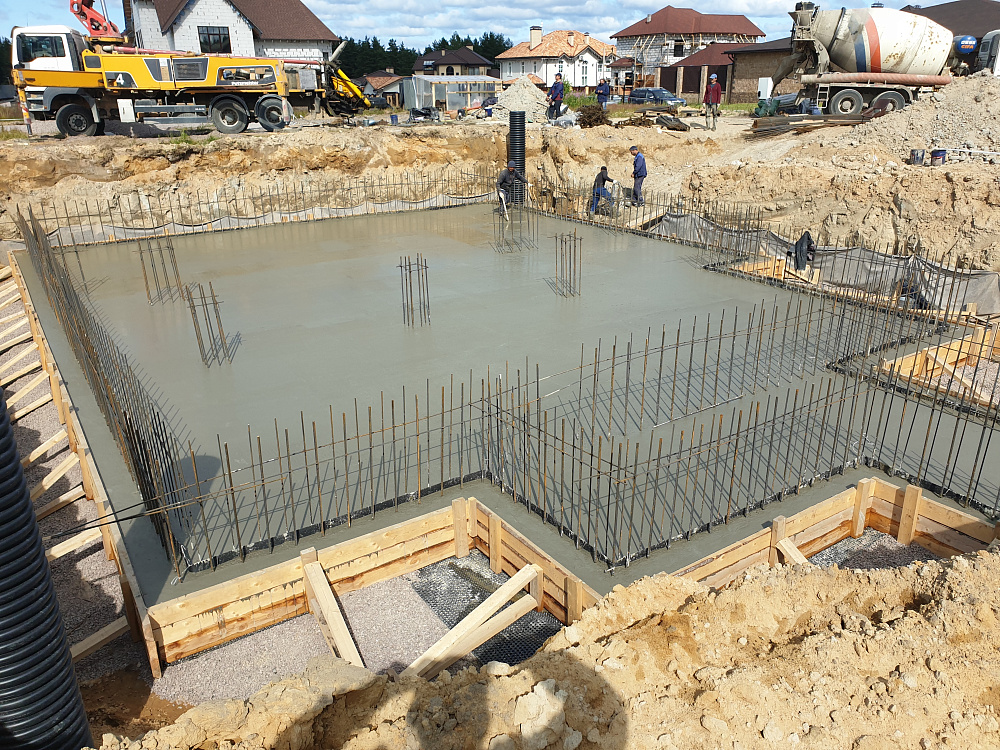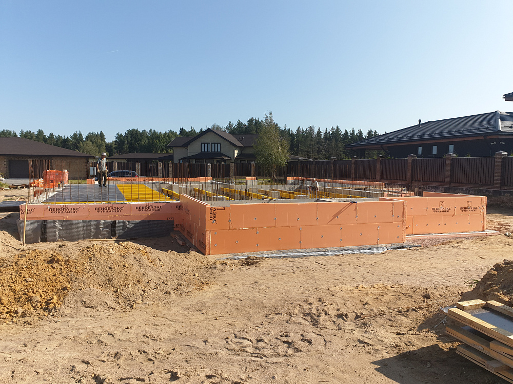 Завершающим этапом строительства цокольного этажа стало устройство монолитного перекрытия толщиной 200 мм. После демонтажа стеновой опалубки смонтировали опалубку перекрытия на инвентарных стойках, выполнили армирование и залили перекрытие одновременно с частью фундамента основного дома — это обеспечило монолитность всей конструкции.