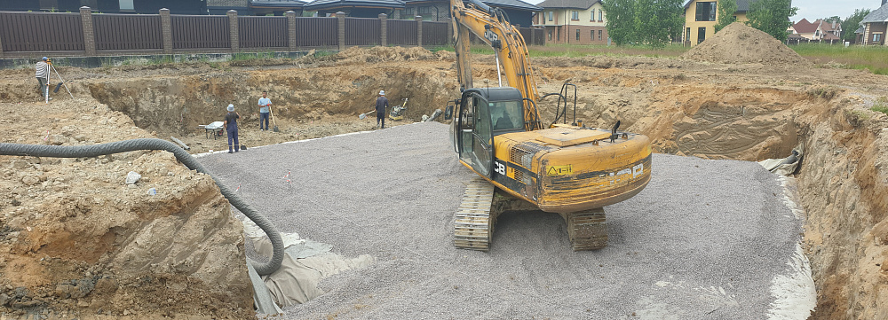 Щебёночная подушка выполняет двойную функцию: является частью дренажной системы и создаёт прочное основание под будущий фундамент.