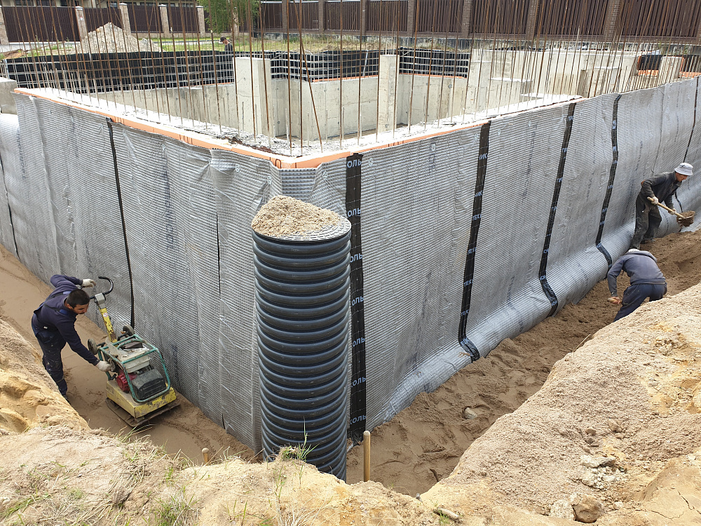 Для защиты цокольного этажа от грунтовых вод и атмосферных осадков выкопали траншеи под систему глубинного дренажа по периметру здания. Технология монтажа: