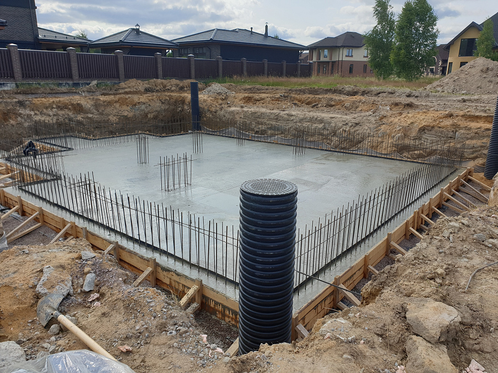 Монолитная конструкция из бетона класса B25 с многослойной гидроизоляцией и глубинным дренажем гарантирует сухость помещений и долговечность цокольного этажа на десятилетия вперёд.